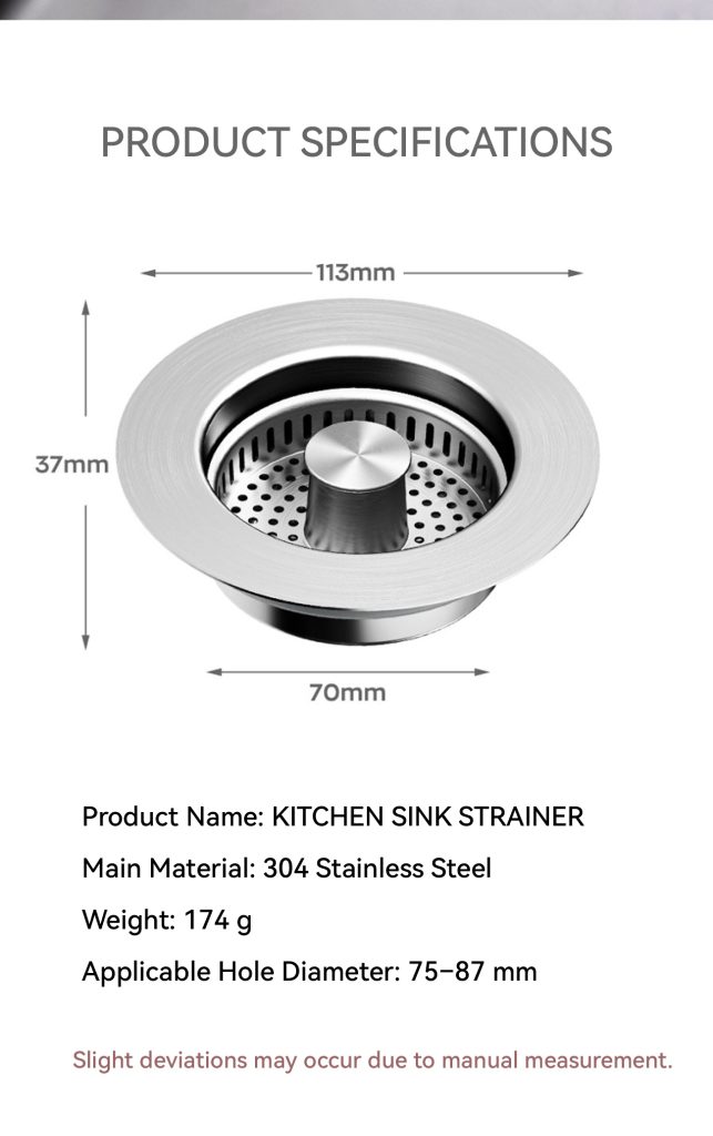 Our spring-loaded sink strainer catches vegetable scraps, rice, and fruit peels, preventing clogs and keeping water flowing smoothly.